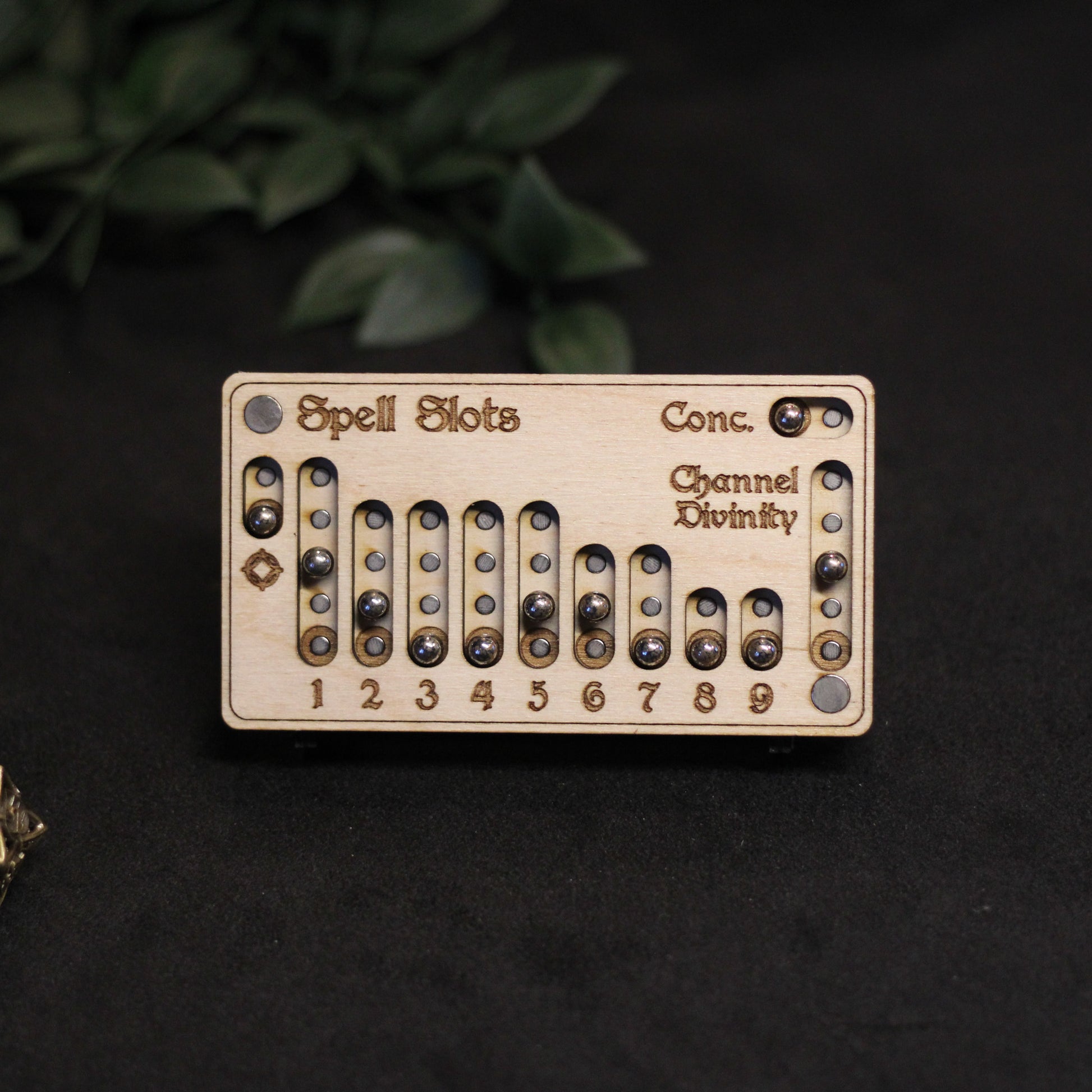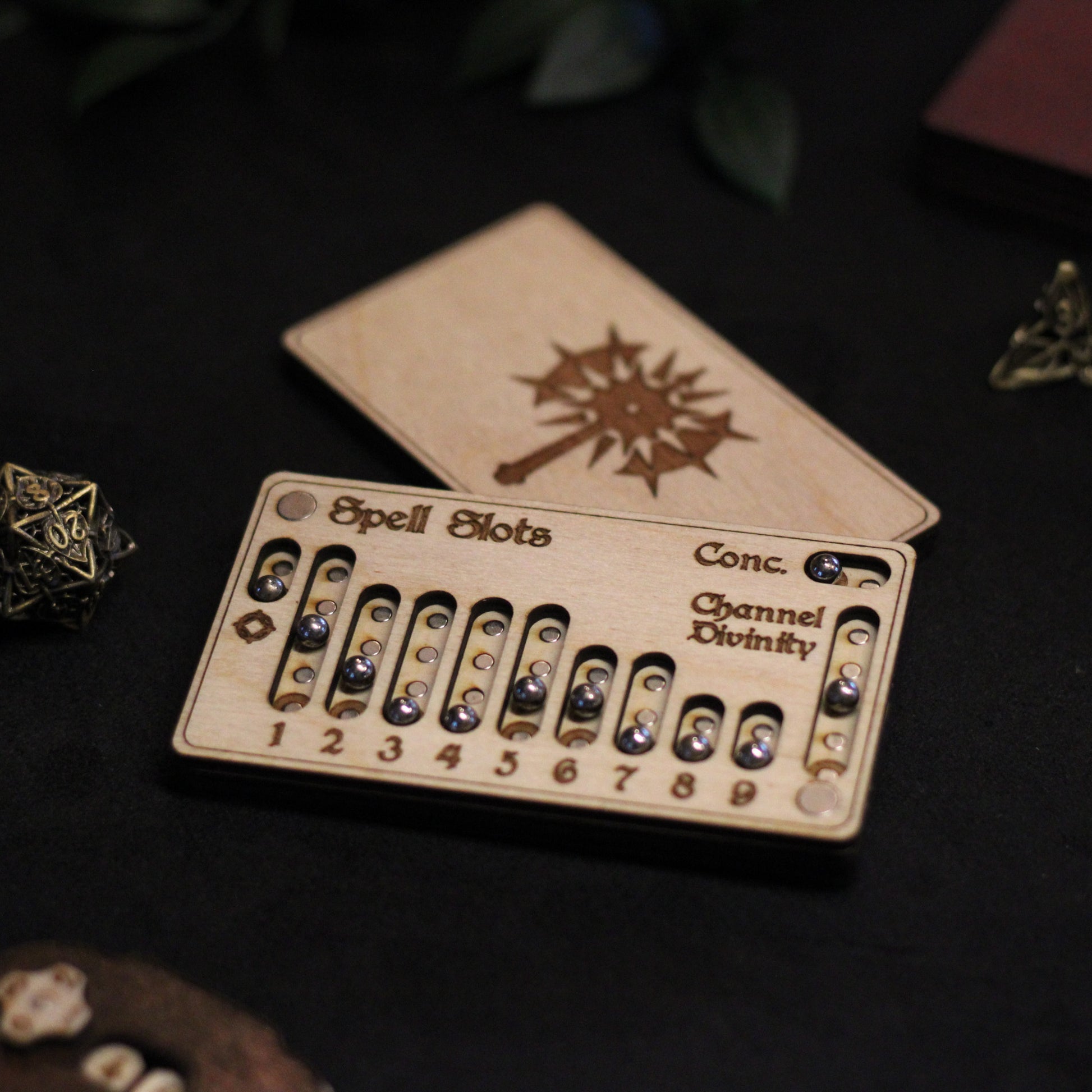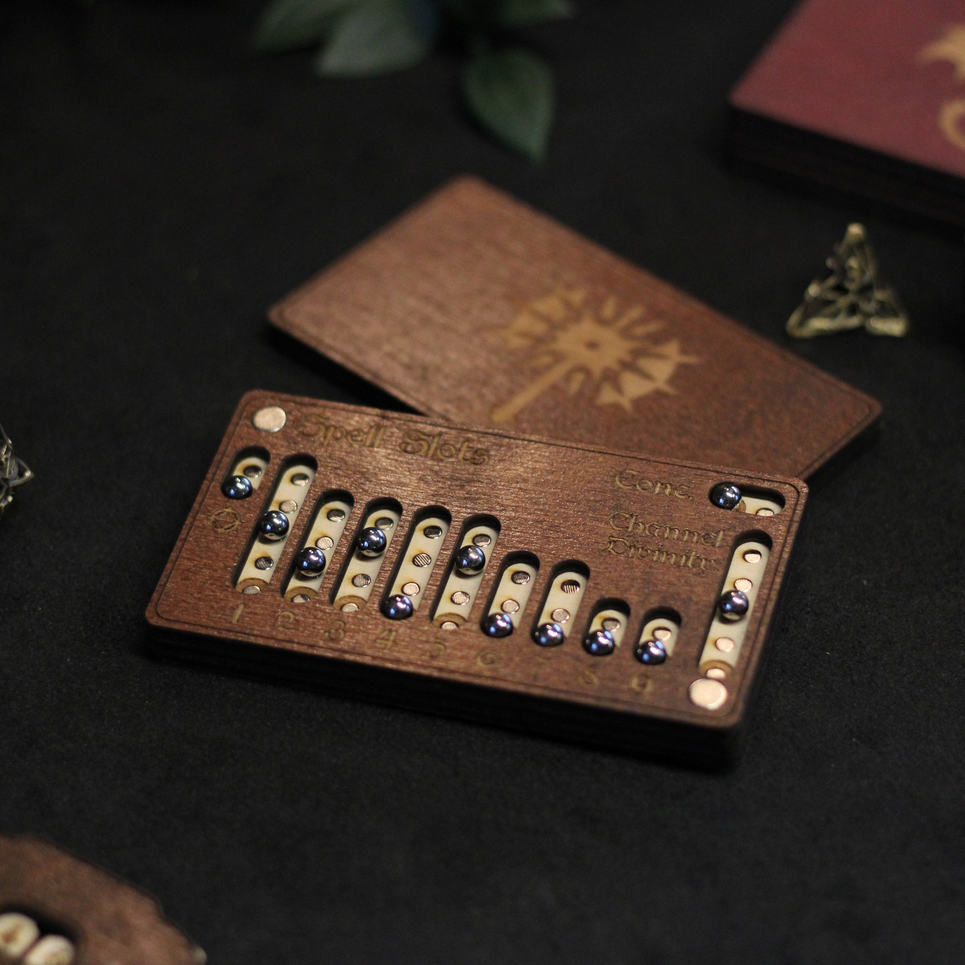 Blijf dicht bij je goddelijke kracht met deze spell slot tracker voor clerics in Dungeons & Dragons. Deze handgemaakte houten tracker bevat schuiven voor spell slots van level 1 t/m 9, een concentration switch en aparte secties voor Channel Divinity en Divine Intervention. Perfect voor elke cleric die orde en overzicht wil in het heetst van de strijd!