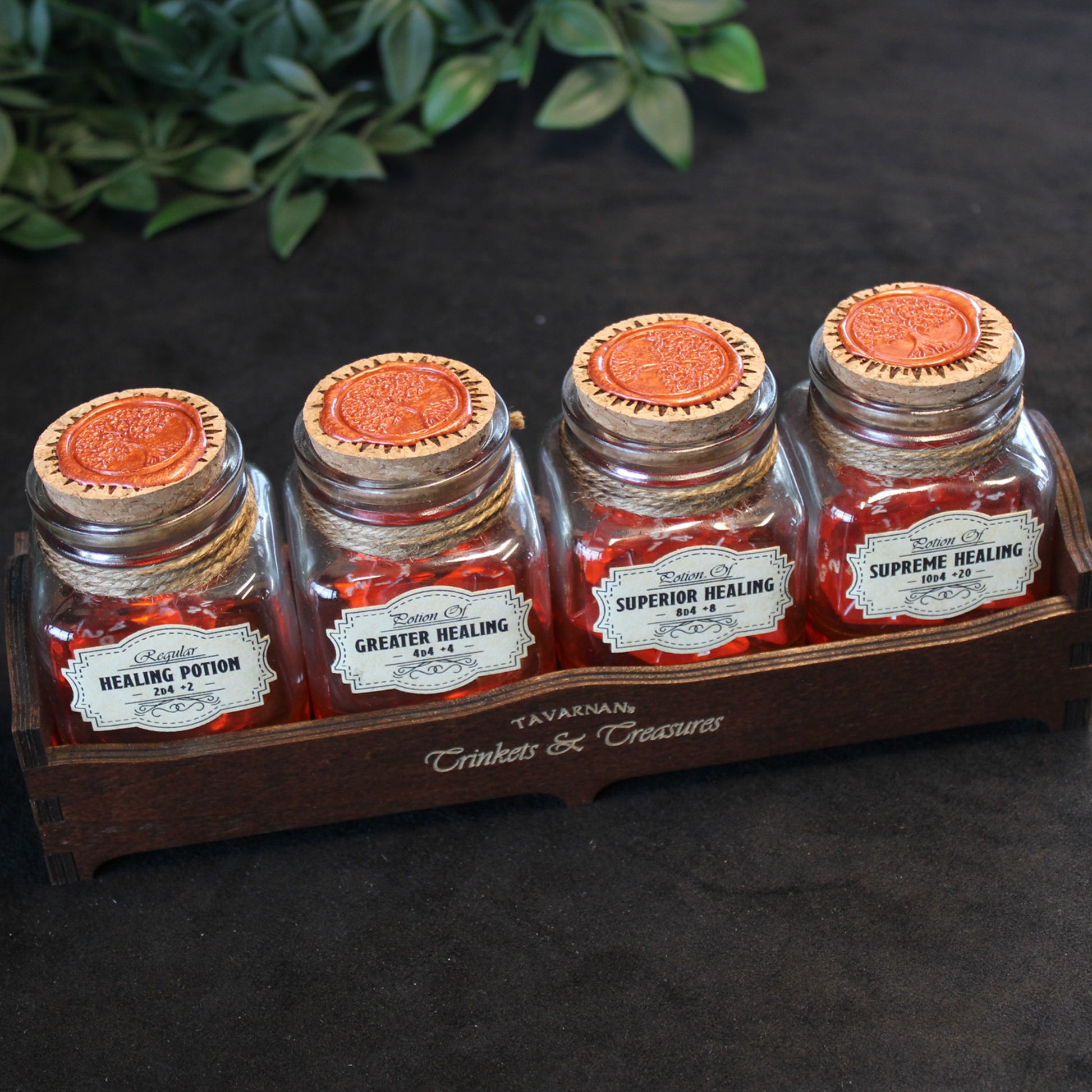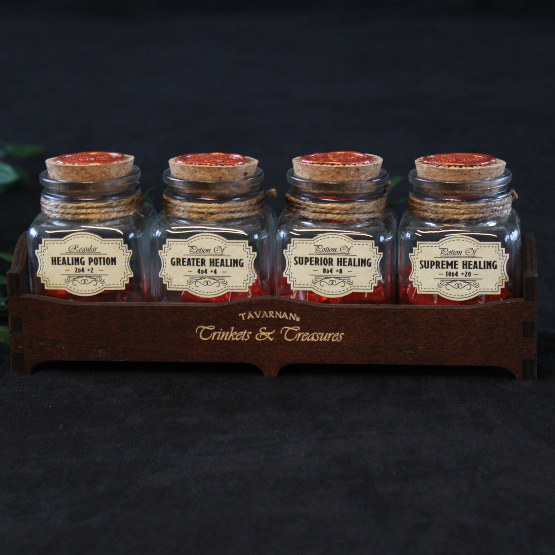 Een compleet arsenaal aan helende kracht. Vier glazen potions (Healing, Greater, Superior en Supreme) in een houten tray brengen organisatie en sfeer naar jouw gamesessie. Perfect voor spelers en DM's die hun helende spreuken overzichtelijk én mooi willen presenteren.