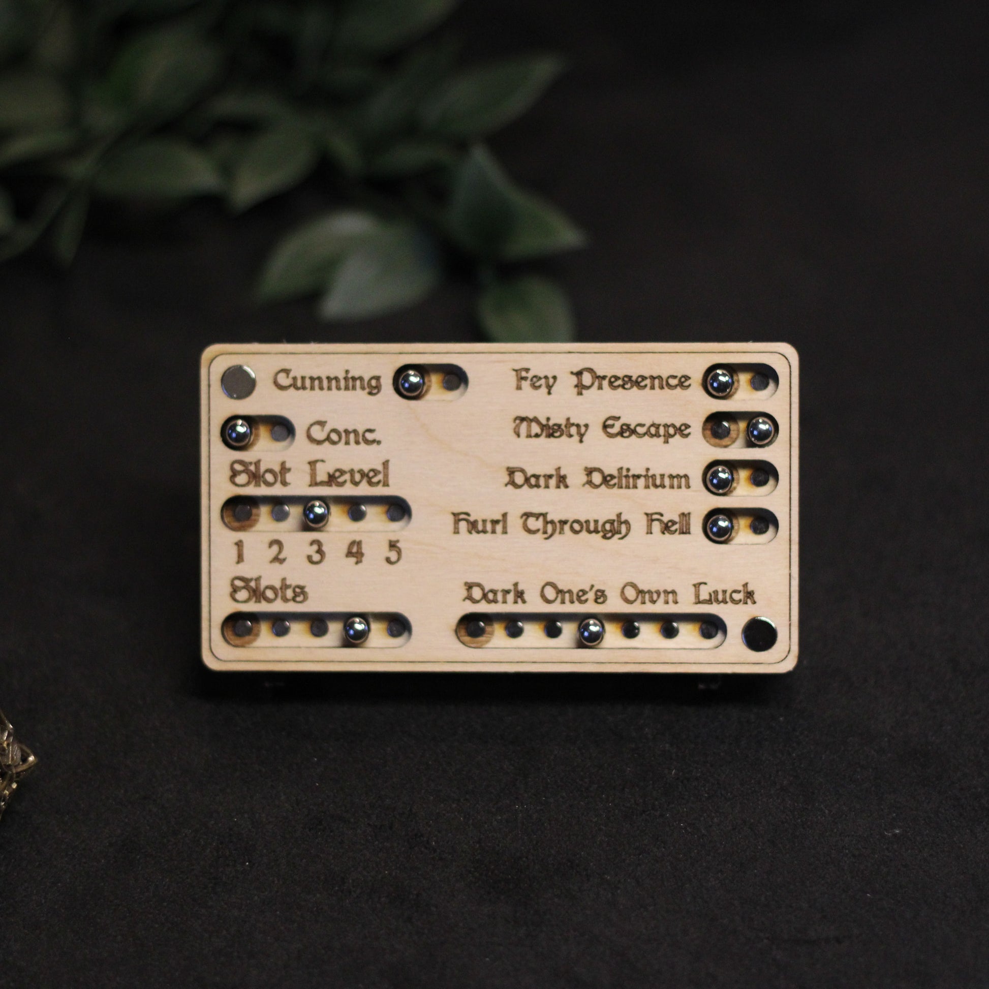 Deze handgemaakte, houten tracker, speciaal gemaakt voor warlocks in Dungeons & Dragons, houdt je pactmagie in toom. Met ruimte voor spell slots, concentration en opties voor alle warlock subclasses, zoals Dark One's Own Luck, weet je altijd wat je nog kunt aanwenden in dienst van je patron!